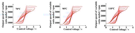 In Figure 11, the steady-state speed control characteristic curve is generated by the data-driven model at the input rotational speed of 4000 rpm and different lubricating oil temperatures.