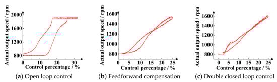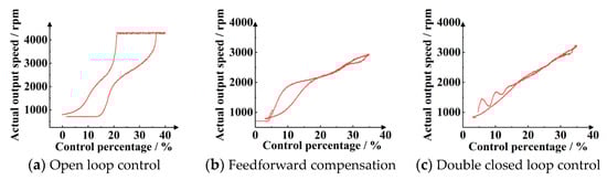 In the process of rotational speed control performance simulation, under different input rotational speeds and control modes (open loop and add inverse compensation control and double closed loop control of temperature and rotational speed), the control signal (unit percentage, linear corresponding proportional valve current) is slowly changed to simulate the steady-state relationship between the control signal and the output rotational speed. The input rotational speed range is 1500 rpm~4500 rpm; according to the input rotational speed, two rotational speeds are selected for the experiment: 2000 rpm and 4500 rpm. At each rotational speed gear, an open loop control experiment, feedforward compensation experiment with inverter ratio model, and double closed loop control experiment of temperature and rotational speed are carried out, respectively. The control signal with an output rotational speed curve is drawn, compared, and analyzed.