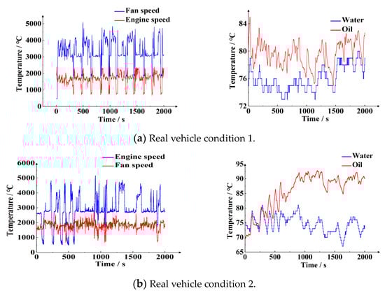Two typical conditions are extracted from the real vehicle data file, including engine rotational speed, fan rotational speed, transmission oil temperature, and water temperature, as the input parameters of the control process. The real vehicle condition acquisition curve is shown in Figure 25.