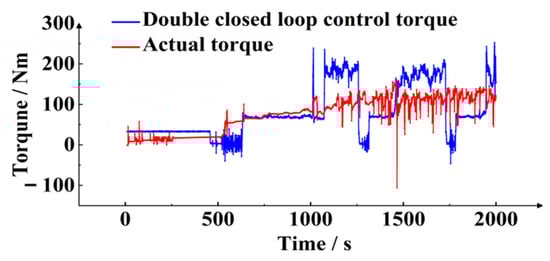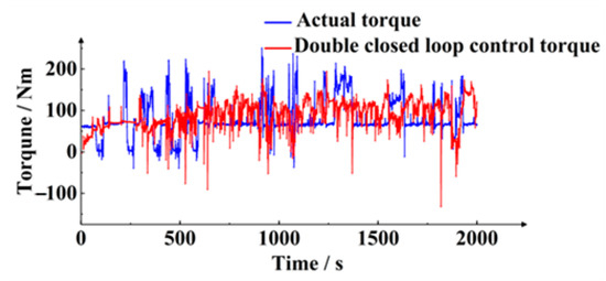 The comparison curve of the dynamic torque of the hydro-viscous shaft is shown in Figure 29. The red is the dynamic torque change curve of the hydro-viscous shaft under the double closed loop control of the temperature and rotational speed controller speed, and the blue is the dynamic torque curve of the real vehicle. It can be seen from the comparison that the double closed loop control of the temperature and rotational speed controller speed significantly reduces the dynamic torque change range, and the dynamic torque change range is reduced from 250 Nm to 200 Nm.