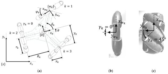 The motion command is provided by the path-planning algorithm implemented in the central control unit of the mobile platform while the path-tracking algorithm computes the kinematics of the platform to obtain the angular velocities of the wheels required to implement the planned path. The total linear velocity of one wheel has two components, one in the drive direction (, collinear with the wheel plane) and one in the slide direction (, parallel with the free-rolling direction):