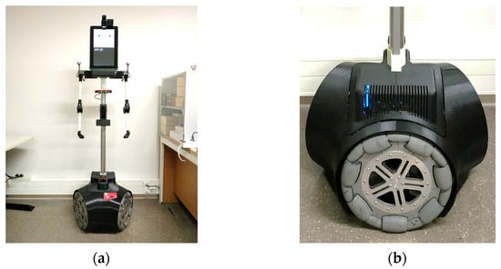 Example of a mobile robot with the 3A omnidirectional platform []: (a) the entire structure of the robot; (b) detail of its omni wheels.