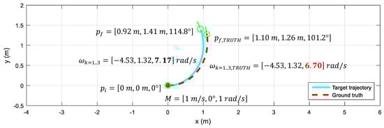 The effect that the maximum angular velocity of the motors can have on the mobility of a system is represented in Figure 3, which shows the trajectory of the robot implementing a motion command with and without considering the limiting effect imposed by the maximum angular velocity reachable by its motors. Figure 3 shows the theoretically expected robot trajectory (cyan, solid line), which does not consider the limiting effect of the maximum angular velocity of the motors driving the wheels, and the ground truth trajectory of the robot (red, dashed line) registered by its onboard odometry (affected by the limit imposed by the maximum angular velocity of the motors). In both cases, the initial position is defined in the world origin () with the robot facing forwards, and the target motion command applied during two seconds to the robot to control its motion is .