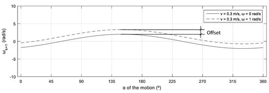 Figure 4 shows that the representation of the profiles of relative to the angular orientation of the linear velocity has a characteristic sinusoidal shape. The difference in the angular velocity of the platform generates a vertical offset in the sinusoidal profile, which has the same value for the whole range of angular orientations . Interestingly, the offset is not dependent on the linear velocity of the platform , but on its angular velocity . This offsetting effect caused by the angular velocity must be taken into consideration when defining an upper bound for the translational velocity.