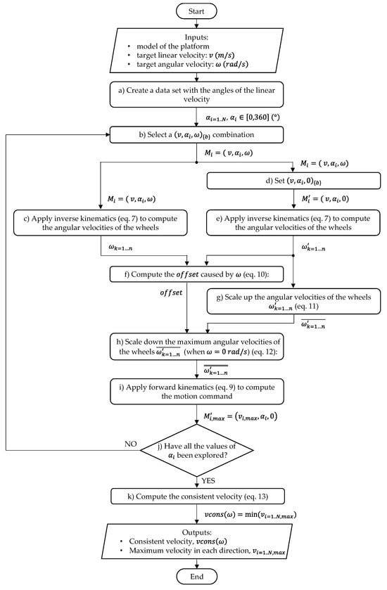 Figure 5 shows the flowchart describing the procedure defined to obtain the consistent velocity of an omnidirectional platform. The inputs of the process are the model of the platform (see Figure 1 and Table 1), the norm of a target linear velocity of the platform (), and a target angular velocity of the platform (). The norm of the linear velocity is used as a seed value that is later normalized, so its initial value is not relevant. The outputs are the consistent velocity of the platform () and the maximum velocity () reachable in each angular orientation of the motion. The procedure is as follows.