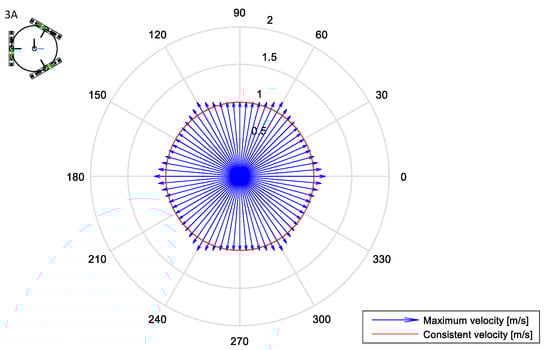 Figure 6 shows the maximum translational velocities and the consistent velocity of the 3A omnidirectional platform when the angular velocity of the platform is . The maximum translational (or linear) velocities are represented as blue arrows in a polar chart to simplify their interpretation. The center of the chart is the center of the mobile platform analyzed, which faces forward towards the 0° direction. The length of the blue arrows depicts the norm of the maximum translational velocities that can be achieved in the directions defined by the angular orientations of the motion.