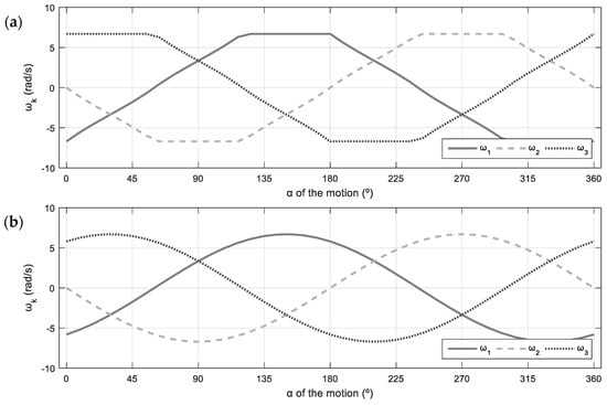 Figure 7 represents the angular velocities of the wheels that correspond to the linear velocities shown in Figure 6, for the case . Figure 7a shows the profile of the angular velocities of the wheels that define the maximum translational velocities achieved by the platform as a function of the angular orientation of the motion . This profile is saturated because, in each angular orientation, one of the wheels must rotate at its maximum velocity. Alternatively, Figure 7b shows the non-saturated profile of the angular velocities of the wheels obtained when the translational velocity is the consistent velocity.