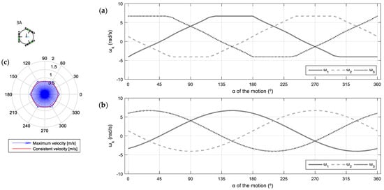 The polar chart in Figure 8c shows that the maximum linear velocities maintain the characteristic hexagonal shape obtained in the previous case for , but with a smaller diameter because the maximum linear velocities are lower to allow the rotation at . The maximum of the maximum velocities is achieved at the same angular orientations as the case with (0°, 60°, 120°, 180°, 240°, and 300°), just as the minimum values (30°, 90°, 150°, 210°, 270°, and 330°). When , the maximum velocities of the 3A platform are between 0.80 m/s and 0.92 m/s, while its consistent velocity (minimum of the maximum translational velocities) is 0.80 m/s, represented with a red circle.