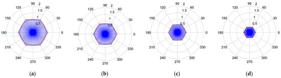 This section highlights the relationship between the angular velocity () and the consistent velocity of the 3A mobile platform. Figure 9 presents four polar charts showing the consistent velocity (red circle) and the maximum linear velocity (blue arrows) that can be achieved in each angular orientation of the motion. The polar charts represent the following cases: (a) ; (b) ; (c) ; and (d) . Although not shown, the polar charts obtained for a specific value of are the same when the angular velocity is positive and negative. The maximum linear velocity and the consistent velocity decrease as the angular velocity of the platform increases.