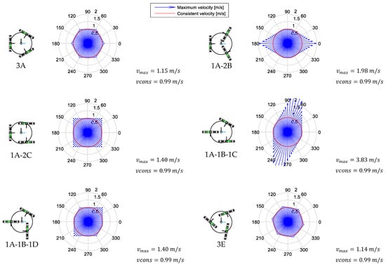 Figure 10 depicts a schematic representation of each of the mobile platforms analyzed, their name, the polar chart representing the maximum velocity achieved in each angular orientation (blue arrows) and the consistent velocity (red circle). Figure 10 also details the maximum value of the maximum velocities achieved by the mobile platform and the value of the consistent velocity obtained for .