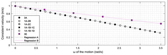 This section analyses the evolution of the consistent velocity of the mobile platforms assessed for the cases of . To this end, Figure 11 represents the values of the consistent velocity of the different mobile platforms assessed for a range of angular velocities from 0 rad/s (no rotation) to 3.5 rad/s (approximately half revolution in 1 s). As argued in the previous section, all the platforms have the same consistent velocity for the case , so other similarities can be expected in the relationship between the consistent velocity and the angular velocity of the motion. Figure 11 shows that the evolution of the consistent velocity relative to the angular velocity of the motion is the same for the platforms 3A, 1A-2B, 1A-2C, 1A-1B-1C, and 1A-1B-1D and can be expressed as the following (Figure 11-regression A):