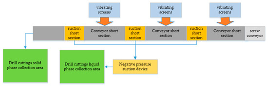 25] introduced a pulsed vacuum negative pressure vibrating screen that incorporates a vacuum negative pressure device at the end of the traditional vibrating screen and utilizes pulsed airflow to create a suction effect, thereby enhancing the drilling-fluid-recovery rate and reducing solid–liquid separation difficulties in mixed liquids. This technology can effectively reduce liquid content in solid-phase material from drilled rock cuttings by 20–30% after treatment, improve liquid reuse efficiency, and significantly lower drilling costs. In 2018, Sizhu Zhou et al. [