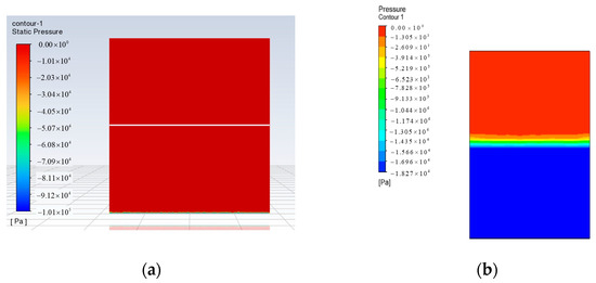 Figure 15. The post-processing analysis of the computational results in Fluent software was conducted, and the pressure distribution of the entire screening chamber was exported. The simulation results are the final simulation results. Due to the gradual compression of the interparticle pores and the increasing tightness of the particle layer, the interception of the airflow is enhanced, so a relatively obvious pressure gradient is formed in the screening chamber.