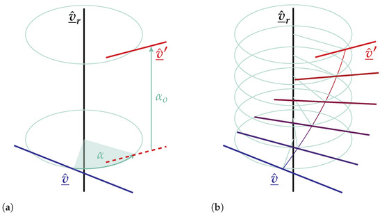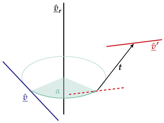 which accounts for a dual rotation around the axis , i.e., a rotation around the axis and a translation along the axis, with the condition that is perpendicular to the line we are operating on and they intersect. Figure 3 illustrates the dual rotation given by the equation