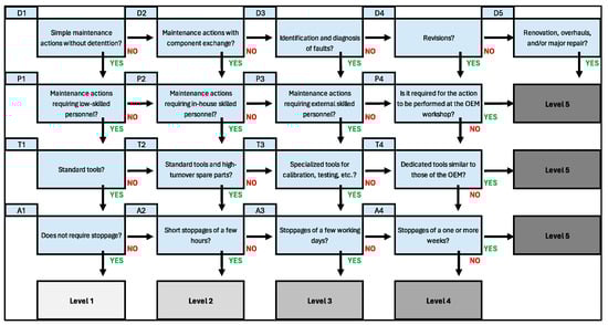 Once the critical failures and the associated maintenance strategies for each have been identified through RCM, the selection of the maintenance action level specified in the UNE 151001 standard, required for each of these critical failures, will proceed. A decision diagram, as illustrated in Figure 1, is proposed as a means of facilitating this process. This diagram, developed based on the RCM decision diagram, allows for the identification of the maintenance levels of the asset under analysis and its critical failure modes, which will be used to continue with the maintainability analysis.