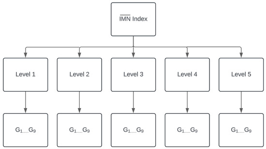 Once the maintainability indicators per level (IMNi) have been calculated, the Aggregate Maintainability Index of the levels () can be calculated. As previously stated, the values of the eigenvector of the weights obtained with the comparison matrix at the second level of the AHP hierarchy are used as weights. This is accomplished by considering the three maintenance levels selected through the MCA procedure. These values are then used to calculate the weighted average of the obtained IMNs. In this instance, the values of the eigenvector of the weights correspond to the following: