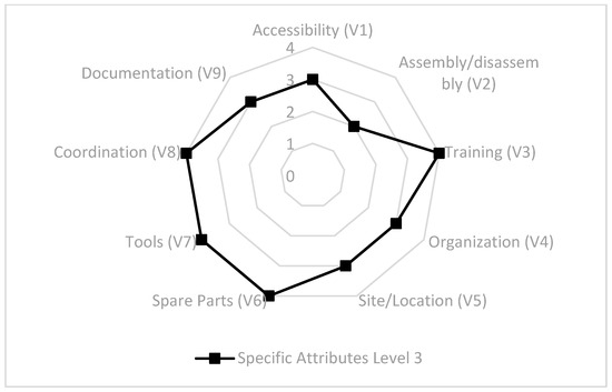 For Training (V3), Organization (V4), Spare Parts (V6), Tools (V7), and Documentation (V9), no significant gaps were identified for improvement in this initial analysis. The radar chart below presents the various ratings of the Maintenance Level 4 Maintenance Indicator (Figure 6).