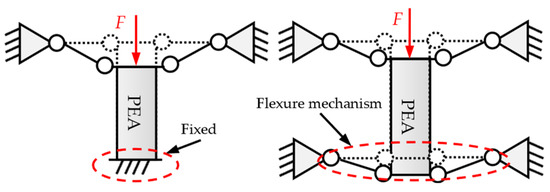 Antagonistic actuation inherits advantages such as fast response, the absence of residual strain, and high resolution, thus enabling swift and precise compensation for the ±δ μm positioning errors of stepper motors. However, in the conventional designs, the tail of each PEA is fixed to the base, as shown in the left side of Figure 2. As a result, each PEA has to bear the preload force and also the driving force of the PEA in the opposite direction. In this case, the PEA’s thrust will damage the other PEA if the load force exceeds the permissible value. To address the above problem, the fixed end of the PEA’s tail is modified to be a flexure mechanism. As shown in the right side of Figure 2, the elastic deformation of the flexure mechanism helps to reduce the stress concentration on the PEA caused by the extension of the PEA in the other direction, thus protecting the PEA.