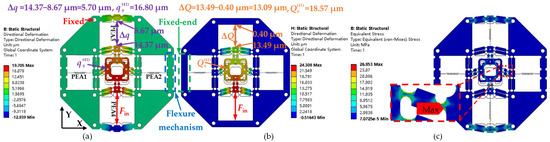 The maximum driving force of Fin = 1000 N is applied to the input ends of the 2-DOF compliant positioning stage along the Y axis. As shown in Figure 6a, the PEA3 is compressed by 5.7 μm under the drive of the PEA4. The selected PEA in this work has a nominal stiffness of 24.39 N/μm. It can be concluded that its load force is 139.02 N, which is less than the allowable load force (400 N). In this case, the output displacement of the moving platform in the +Y direction is 16.80 μm.