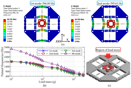 (a) Mode shapes of the 2-DOF compliant positioning stage with PEAs and load mass, (b) relationships between the natural frequencies and the load mass and the (c) region of load mass.