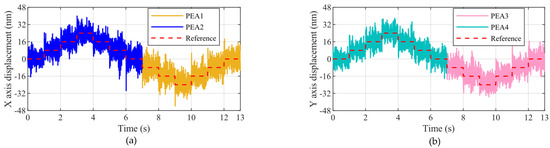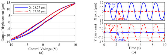 Firstly, in open-loop mode, the hysteresis loops of the 2-DOF compliant positioning stage on X and Y axes are tested to obtain its travel range. The test results are shown in Figure 9a. According to the measurements, the strokes of 28.27 μm (−13.87~14.40 μm) and 27.62 μm (−13.31~14.31 μm) can be achieved on the X axis and Y axis, respectively. As shown in Figure 9b, when only one X axis is driven by a sinusoidal signal with an amplitude of 14 μm and a frequency of 0.5 Hz, the output displacement along the Y axis is measured, exhibiting a maximum coupled motion of 0.38 μm. Employing the same driving methodology to actuate the Y axis, the maximum coupled motion observed along the X axis is measured to be 1.17 μm.