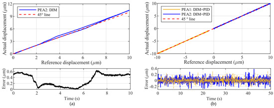The direct inverse modeling (DIM) method [45] is used to construct feedforward hysteresis compensators for the PEAs. The modeling accuracy of the hysteresis compensator can be found in Figure 10a. Thus, proportional–integral (PI) controllers are adopted as the feedback controller to further account for the dynamic characteristics of the 2-DOF compliant positioning stage. Finally, the compensation effect of the DIM + PI composite control on the X axis is shown in Figure 10b.