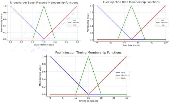 The fuzzy sets for each input and output parameter are defined using triangular membership functions (Figure 4). These are selected for their simplicity and effectiveness in modeling the uncertainty and variability in engine parameters.