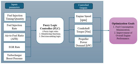Predictive maintenance involves forecasting and addressing potential failures before they occur [24]. Fuzzy logic, which can handle imprecise and uncertain data, is well-suited for predictive maintenance applications. The FLC system can analyze real-time data from various sensors and predict the likelihood of component failures based on trends and patterns [24]. FLC can also optimize preventive maintenance schedules by considering multiple operational parameters and their interactions. Traditional maintenance schedules are often based on fixed intervals, which may not reflect the actual condition of the engine. In contrast, FLC-based scheduling is dynamic and adapts to the real-time state of the engine [24,25,26,27].