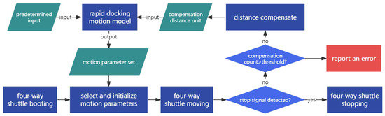After the four-way shuttle boots, the rapid docking model calculates the motion parameter set according to the predetermined input, including load capacity, predetermined transfer speed, and predetermined braking distance. The appropriate initial motion parameters of the four-way shuttle are randomly selected from the motion parameter set. Then, the four-way shuttle starts to move and detects the stop signal in the braking stage. If the stop signal is detected, the four-way shuttle stops immediately by way of boosting the deceleration. Otherwise, the next round of motion parameters calculation and docking signal detection is performed until the four-way shuttle arrives at the stop point. See Figure 2.