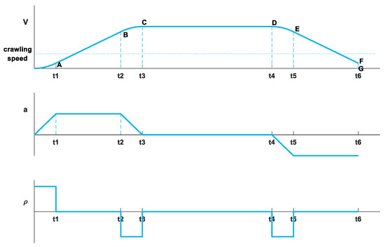The rapid docking algorithm can be divided into the following 3 stages. Phases OA, AB, and BC belong to the starting stage. The high-speed movement is performed in phase CD. The braking stage consists of phases DE, EF, and FG. These phases are shown in Figure 3, where V is the real-time speed, a denotes the acceleration, and represents the jerk. The whole motion process is open-loop.