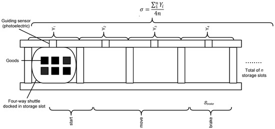According to Formula (7), where , the four-way shuttle has detected the stop signal and stops immediately when it is just at . The four-way shuttle has detected the stop signal during phase DE, where . It is required for the uniform deceleration where , showing that the four-way shuttle has detected the stop signal during phase EF.