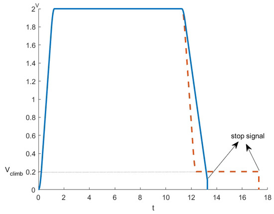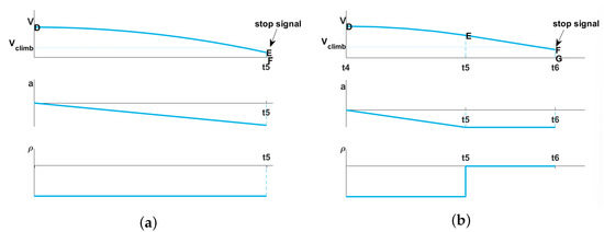 When the four-way shuttle detects the stopping signal during the variable deceleration motion (phase DE), there is no need to perform the uniform deceleration motion, as shown in Figure 5a. The relationship among jerk , deceleration a, real-time velocity V, and the actual braking distance S at this time is analyzed as follows: