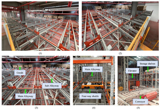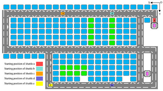 Within the factory’s warehouse, the whole system consists of main alleys, sub-alleys, storage shelves, conveyors, four-way shuttles, and elevators, with entry and exit ports on each level (see Figure 6). Various shuttles are chosen, and the positions for stored goods as well as the locations for goods to be stored are randomly selected. Figure 7 provides an example of one floor in the warehouse with four-way shuttles.