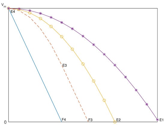 When m/s, , = 2, = 4, = 8, and approaches infinity, the speed curves during the braking stage are shown in Figure 8. or 4 conforms to situation I. conforms to situation II. The variable deceleration motion is neglected where tends to infinity; it can be regarded as just the uniform deceleration motion. The deceleration methods for different braking speed curves are referenced in Table 1.