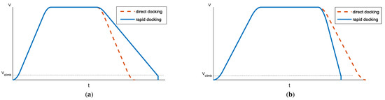 The velocity curves of rapid docking and direct docking. (a) The real distance is longer than the guiding distance. (b) The real distance is shorter than the guiding distance.
