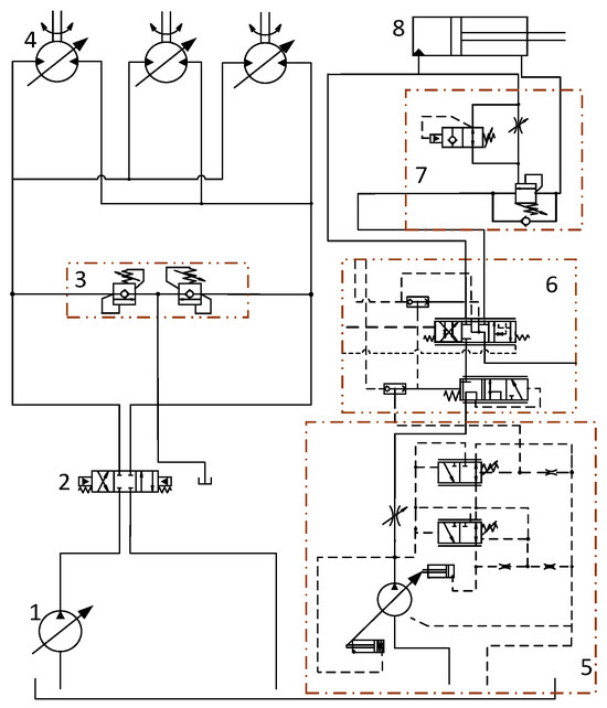 where Q 1 and Q 2 denote the flow rates for the rodless and the rodded chambers of the pressurization cylinder, respectively; W represents the area gradient of the auxiliary valve orifice in the pressurization unit; xv refers to the displacement of the valve spool of the pressurization auxiliary valve; p s signifies the supply oil pressure; and p 1 and p 2 designate the pressures within the rodless and the rodded chambers of the pressurization cylinder, respectively.
