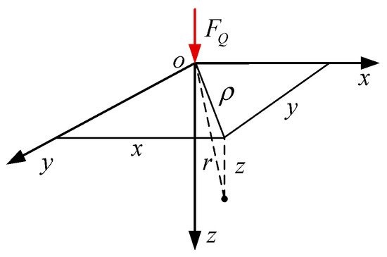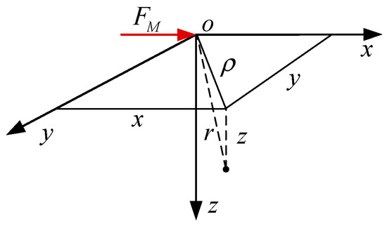The rock surface is subjected to cutting force F M from the drilling tool. Disregarding the size of the drilling tool and the self-weight of the rock mass, the stress state at any point within the rock can be equated to the stress sketch shown in Figure 3.