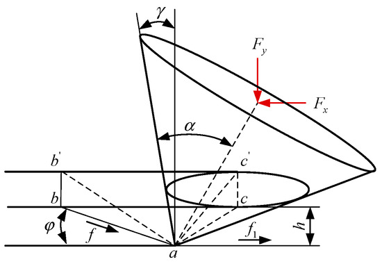 The positive and shear stresses are generated by intrusion forces F Q , and cutting forces F M exceed the ultimate compressive and shear strength of the rock, i.e., where the soil body is damaged and rock cutting is realized.
