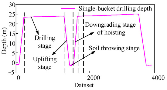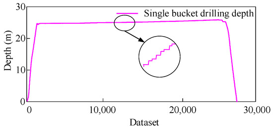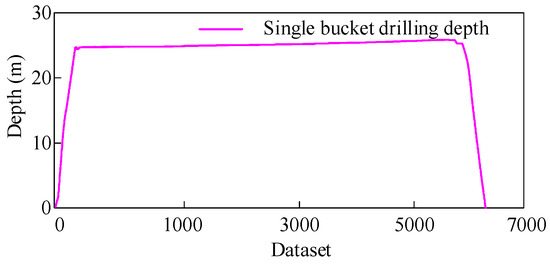 To reduce the data redundancy and improve the data value, the rotary drilling rig engineering data are processed with frequency reduction from 200 Hz to 5 Hz, which greatly reduces the data volume and improves the data processing speed. The data can still accurately respond to the data characteristics in the drilling process after the data frequency reduction, which ensures the sample size under a certain time scale, and it can realize the prediction of drilling efficiency under a time scale of seconds. Figure 6 shows the single bucket winch depth after frequency reduction.