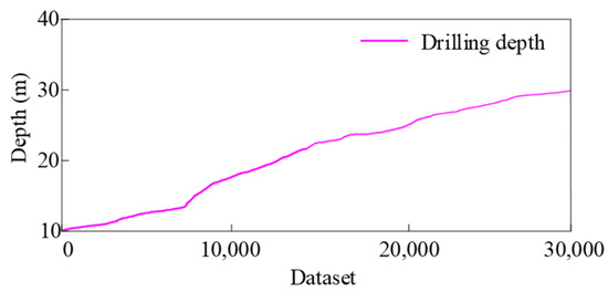 The engineering data of the rotary drilling rig mainly rely on the SoMateDAQ acquisition instrument to collect the parameters of the various systems of the rotary drilling rig. This article collected data from two adjacent pile holes, and the geological information of the two pile holes was essentially consistent. The depth of each pile hole was 30.5–31.5 m. A total of seven signal sources were collected, including the pressure of the large and small chambers of the pressure cylinder, the inlet and outlet pressure of the power head motor, the power head speed, the drilling depth, and the engine speed. Among them, the moderately weathered and strongly weathered rock layers at a depth of about 22 m in Hole 1 were selected for model training, and the moderately weathered and strongly weathered rock layers at a depth of about 22 m in Hole 2 were selected for subsequent experimental verification. Table 1 shows the obtained dataset and data processing methods.