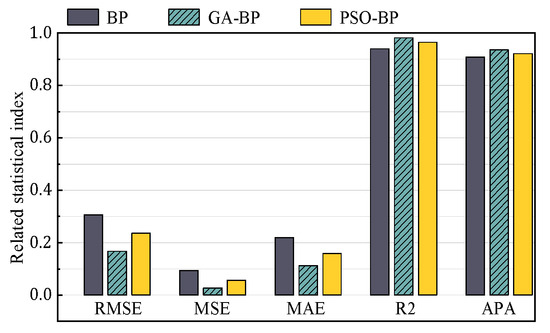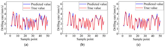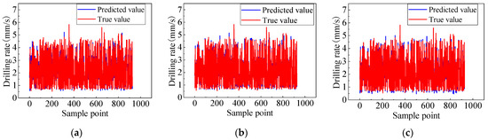 Figure 16. Comparison of the true values of the three types of neural network predicted values. (a) Comparison of the true values of the BP neural network predicted values. (b) Comparison of the true values of the GA-BP neural network predicted values. (c) Comparison of the true values of the PSO-BP neural network predicted values.