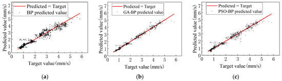 Figure 15. Fitting effect of the three types of neural network test data. (a) Fitting effect of the BP neural network test data. (b) Fitting effect of the GA-BP neural network test data. (c) Fitting effect of the PSO-BP neural network test data.