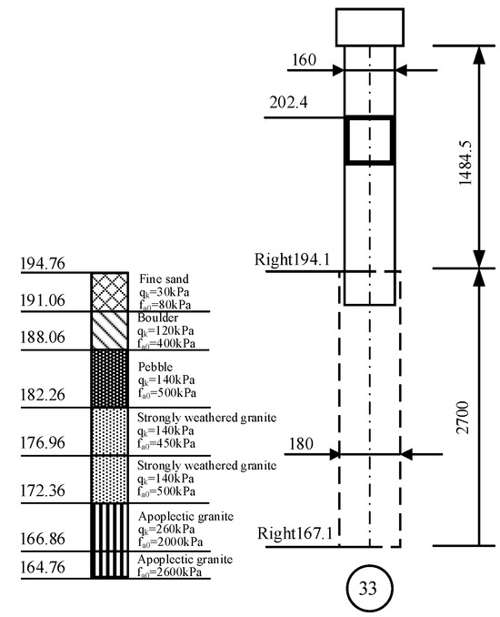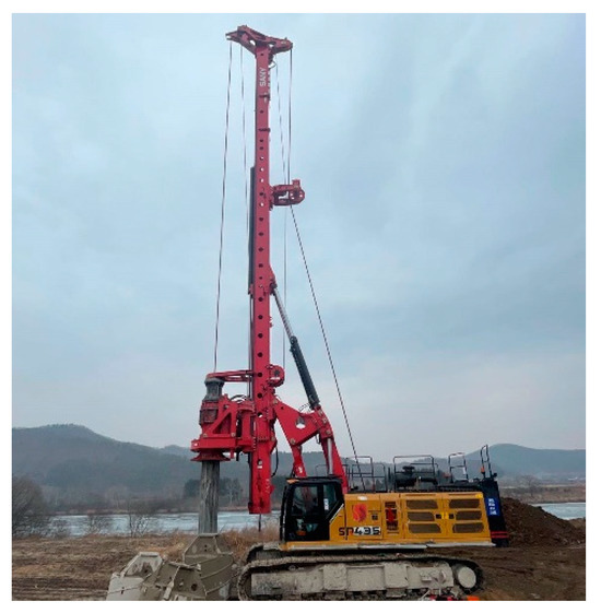 This article relies on the construction of the New Hefei West Station Comprehensive Development Zone and East Square project, and it used the 405 rotary drilling rig for dry-hole drilling the support piles at the construction site. During the pile driving process of the rotary drilling rig, the first step was to excavate 3 m downward and to expand the pile hole to a diameter of 1.5 m. Then, the 1.5 m-diameter casing was pressed into the pile hole for wall protection. A drill bucket with a diameter of 1.2 meters is used for drilling operations from around 0–26 meters. After 26 m, a 1.2 m-diameter cylindrical drill was replaced for the drilling operations to the designed hole depth. Among them, the pile diameter was 1.2 m, the pile depth was 30.5–31.5 m, and a machine lock drill rod was used, with a model of Φ 580 × 4 × 19 and a weight of about 20.2 tons. The drilling tool was a 1.2 m, rock-embedded, and double-bottom straight-tube sand bucket, and a 1.2 m-toothed cylinder drill.