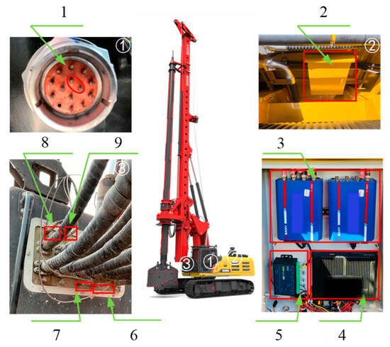 Figure 18. Detailed information on the components of the rotary drilling rig test acquisition equipment. 1. CAN signal acquisition point; 2. data acquisition cabinet; 3. data acquisition instrument; 4. on-board computing unit; 5.CAN protocol acquisition instrument; 6. pressurized cylinder large cavity sensor; 7. pressurized cylinder small cavity sensor; 8. power head motor inlet pressure; 9. power head motor outlet pressure.
