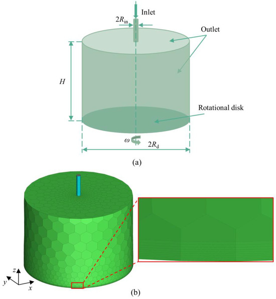Figure 1a shows a three-dimensional computational domain. Since the liquid-phase resin is injected into the disk surface from the nozzle, the formation of the liquid film is affected by the flow conditions of the jet flow. Therefore, the nozzle is considered as the inlet, and the space between the nozzle and the disk is included in the computational domain for capturing the jet flow characteristics. A nozzle with a diameter of 4 mm is located symmetrically directly above the center of the disk. The solution enters the computational domain from this nozzle at a certain velocity and then flows over the surface of the stainless steel disk with a diameter of 100 mm. The computational domain with a height of 70 mm comprises only a limited portion of the air above the rotating disk to acquire a lower computational cost.