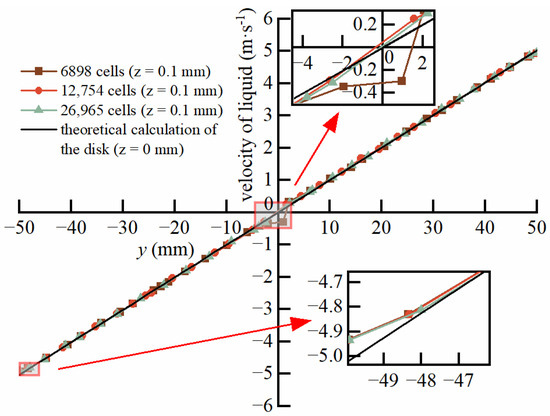 A grid-dependency test wherein the number of grid cells varied from 26,965 to 6898 was performed to measure the impact of grid density on the accuracy of simulation results. Under identical conditions, calculations were conducted to compare and analyze the velocity fields at specific locations (x = 0 mm, −50 mm ≤ y ≤ 50 mm, z = 0.1 mm) with different grid densities. Figure 2 shows that with the increase in grid density, the distribution of the velocity field gradually changes, and the theoretically calculated tangential velocity distribution for the rotating disk at different radial positions has been provided as a comparison. The disk rotational velocity refers to the disk surface (z = 0 mm), while the liquid-phase tangential velocities are taken at z = 0.1 mm. It can be seen that there is a small difference between the theoretical calculation and the simulation results. Although increasing grid density helps enhance the accuracy of simulations, it also leads to an increase in computational workload. Taking both the accuracy of simulation results and computational cost into account, 12,754 grids were selected for subsequent simulation work.