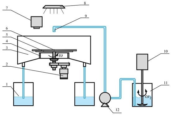 Figure 3 shows a schematic of the experimental apparatus. The experimental media were a diamond-resin solution with a 10% mass fraction, and the physical parameters were the same as the simulation as listed in Table 1. The selected light-curing resin is transparent in color and is compatible with a wavelength of 405 nm. Single crystal diamond micro-powder with a particle size of W28 was selected as the abrasive. The solution as the working fluid was mixed in the storage tank by the stirrer and then transported to the nozzle through hoses via a peristaltic pump. The solution entered the disk surface vertically from the central position of the disk through the nozzle. The nozzle with an inner diameter of 4 mm was 70 mm away from the surface of the disk. The disk was made of 304 stainless steel with a diameter of 200 mm and a thickness of 1 mm. The disk was secured by a bracket to the rotating shaft and was driven by a motor through a gear mechanism. As the disk rotated, the solution spread as a film over the disk surface and then reached the edge of the disk. With the continuous rotation of the disk, the solution then left the edge of the disk at a certain velocity, traveled until it impacted the inner wall of the collecting housing, and finally fell to the bottom of the collecting housing. It flowed along the inclined bottom of the collecting housing and was discharged at the outlet into recovering vessels. The UV curing lamp was positioned directly above the rotating disk. After the solution ceased to enter the disk surface, the UV curing lamp started operating to cure the liquid film on the surface of the rotating disk, forming a single layer of cured diamond resin. By repeating the above operation, layer by layer, grinding tools of different thicknesses can be prepared. This study focuses on the research and analysis of grinding tools with only one layer of diamond resin. A high-speed camera (Phantom V2511, AMETEK, Berwyn, PA, USA) with a shooting speed of 1000 pps and a resolution of 1280 × 800 was placed above the rotating disk to observe the flow state of the liquid film on the disk surface. Figure 4 shows the photograph of the experiment setup. As shown in Figure 4, the experimental platform mainly consists of supporting aluminum materials, a rotating disk, a peristaltic pump, a nozzle, an elevating screw mechanism, a guide rail mechanism, and a high-speed camera. The dimensions of the aluminum frame are 540 × 540 × 800 mm.