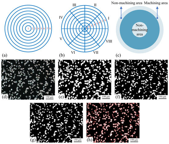 (a) Circumferential grid division; (b) radial grid division; (c) the division of machining area and non-machining area; (d–h) image processing including original image, binary image, image noise removal, image segmentation, and particle counting.