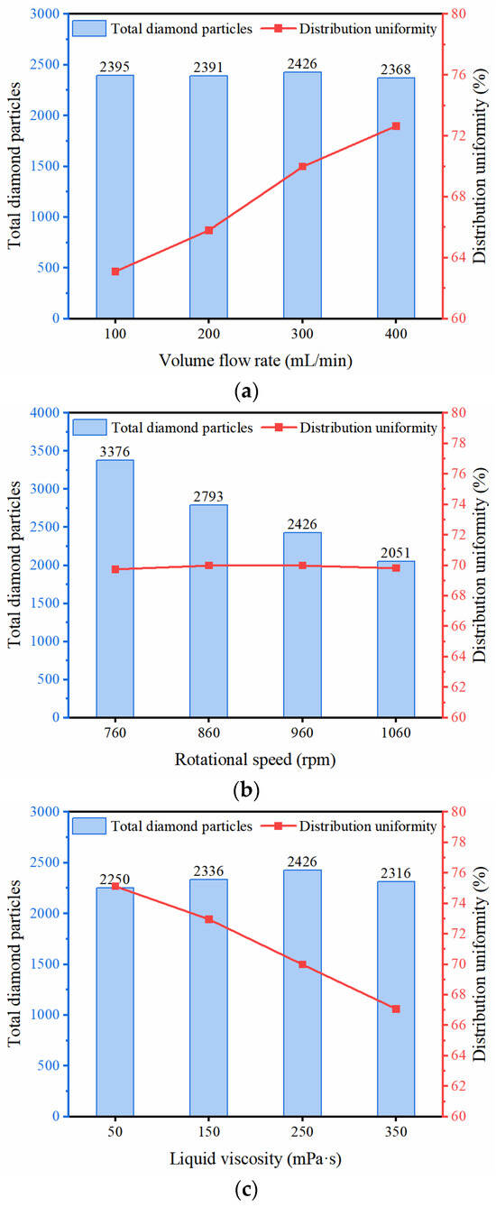 Distribution uniformity and total number of diamond particles under different (a) liquid volume flow rates, (b) different disk rotational speeds, and (c) different liquid viscosities.