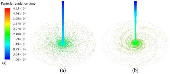 Figure 6a shows the axial view of the overall model after convergence of the computation under the operating parameters of liquid volume flow rate of 100 mL/min, disk speed of 960 rpm, and liquid viscosity of 250 mPa·s. It displays the 3D trajectories of abrasive particles throughout the entire computational domain. It can be observed that the abrasive particles enter vertically from the nozzle onto the disk surface, with the highest concentration in the central region of the disk, then dispersing in a spiral shape from the center towards the edge of the disk. The direction of rotation of the disk is counterclockwise. Visibly, the spiral direction of the abrasive particles’ movement on the disk surface is opposite to the direction of disk rotation.